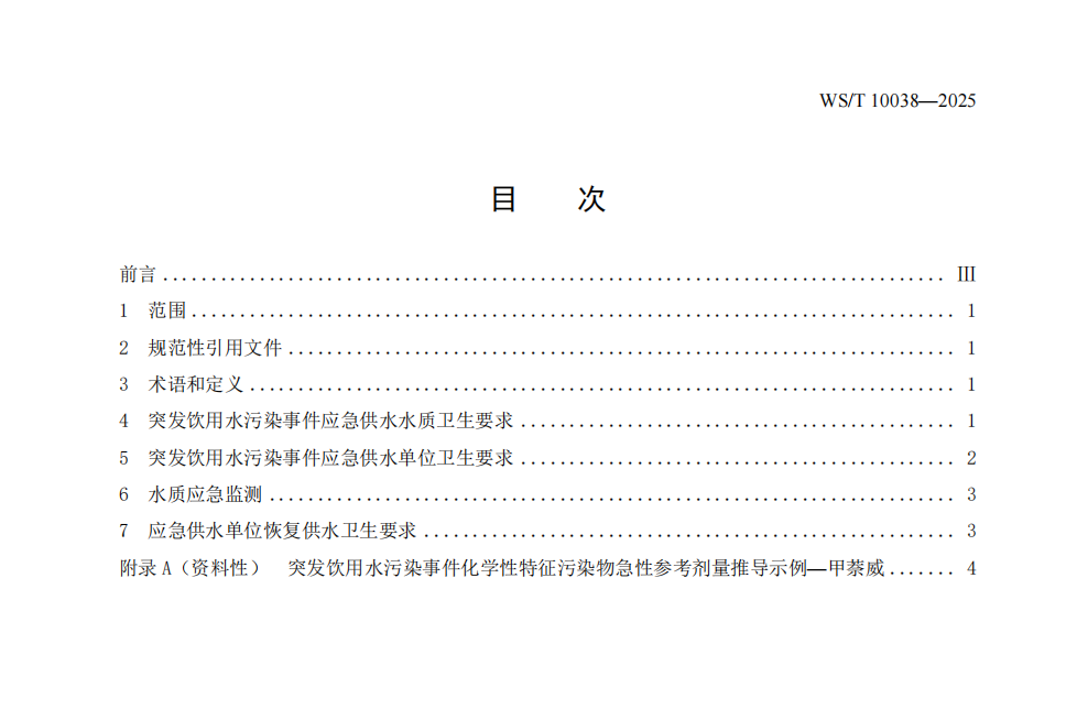 近日,国家卫生行业标准《突发饮用水污染事件应急供水水质卫生标准》(WS/T 10038—2025)(以下简称《标准》),经国家疾病预防控制局正式发布。 该《标准》是我国首部专门针对发生突发饮用水污染事件时应急供水水质制定的卫生标准,标志着我国在饮用水卫生应急管理领域取得重大突破,填补了相关领域标准空白,对提升公共卫生事件应急处置能力具有重要意义。 同时,该《标准》还是《生活饮用水卫生标准》(GB 5749—2022)的重要补充,构成了我国日常供水和应急状态下供水水质标准完整的饮用水标准体系。