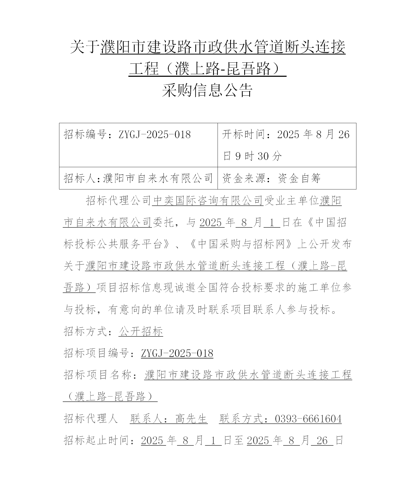 关于濮阳市中原路市政供水管道工程(濮上路-兴濮路)招标信息公告