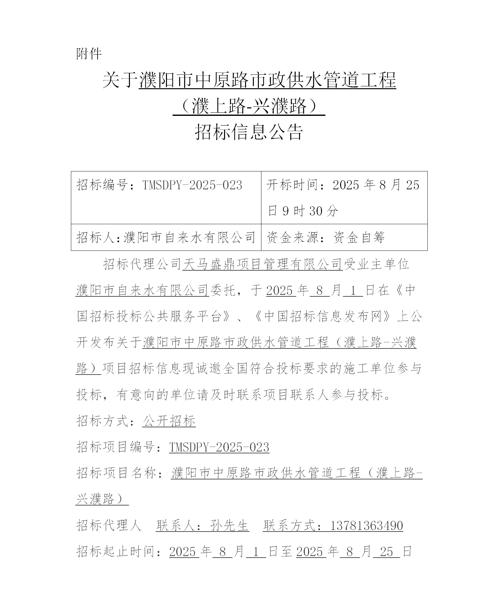 关于濮阳市中原路市政供水管道工程(濮上路-兴濮路)招标信息公告