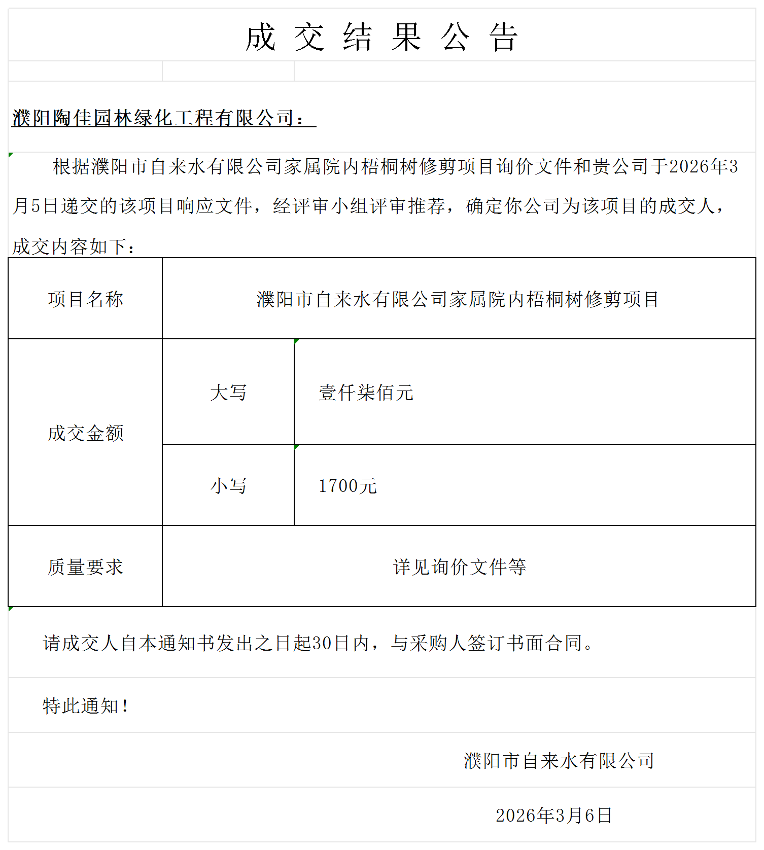 濮阳市自来水有限公司家属院内梧桐树修剪项目成交结果公告